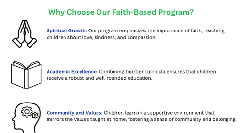 At Community Church Preschool, we are proud to offer a Faith-based and/or Christian education. Our Faith-based programs integrate spiritual development with academic excellence, providing a well-rounded education that nurtures the mind, body, and spirit of each child. We have developed a welcoming, safe environment that fosters a love of learning and spiritual growth in each child. We bring Faith into the classrooms in many ways, such as Prayer before meal times and teaching Bible stories with worship songs. Our curriculum is based off of God's Big 10 Rules, developed in-house by our highly skilled administration team to urge a connection between religion and preschool. Our Faith-based program is designed to stimulate your child's curiosity and instill strong moral values, while effectively training him or her to learn confidently. Community Church Preschool welcomes children of any denomination.