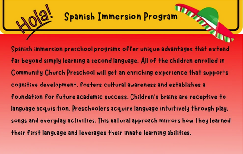 Our preschool program is designed to encourage our three-year-olds to develop respect and appreciation for other cultures through our curriculum, including weekly Spanish classes taught by an experienced bilingual preschool teacher. Children learn language skills through stories, music, and games in an immersive, interactive environment, with a learning program tailored to preschoolers’ unique needs.